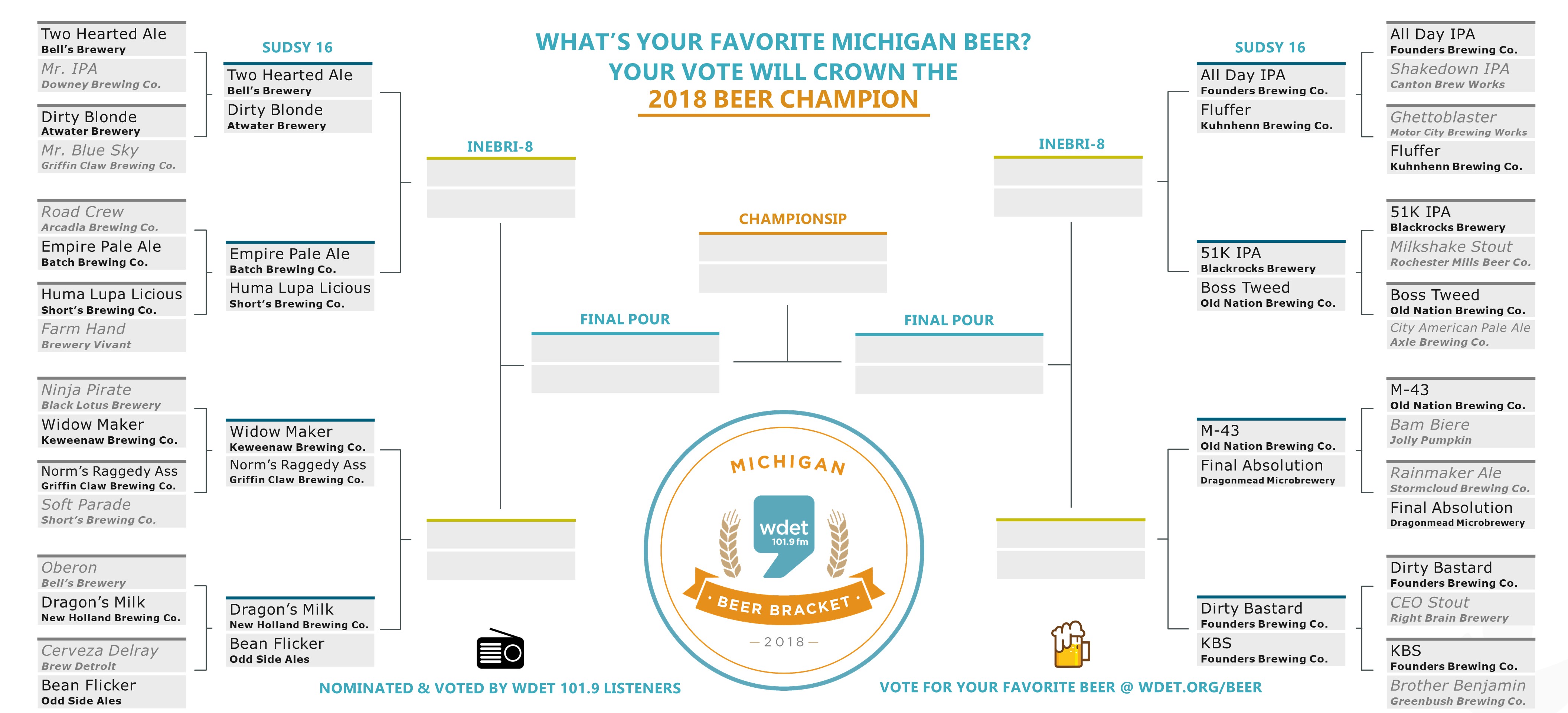 • The remaining rounds include the Inebri-8 (10/19 – 10/23), the Final Pour (10/24 – 10/28) and the Championsip (10/29 – 11/1) with the inaugural winner of the 2018 WDET Michigan Beer Bracket announced on Friday, November 2nd.