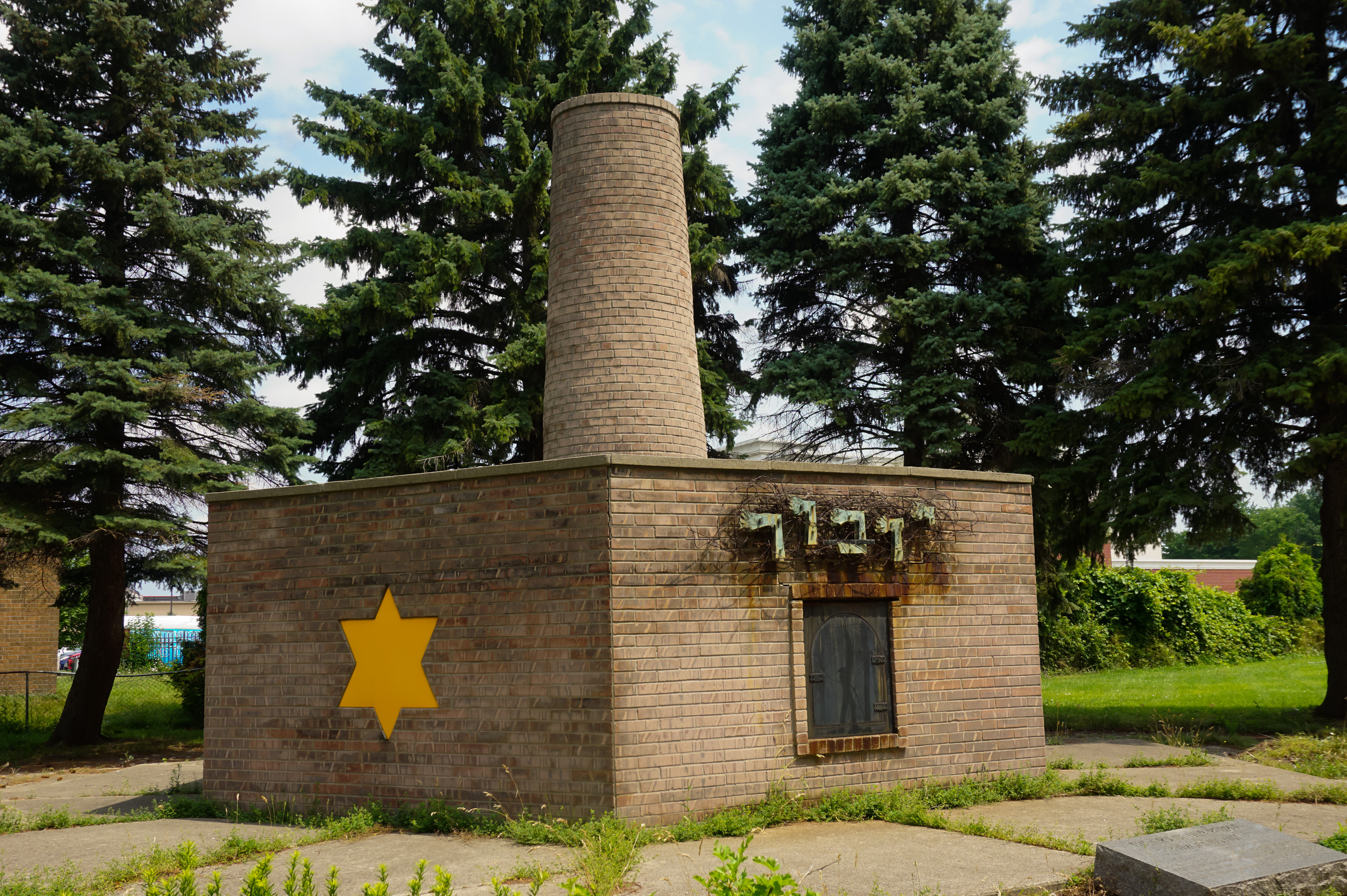 He points to another reminder of the Holocaust in the cemetery, a cement building painted with a yellow star and shaped like the kind of crematoriums used in Nazi concentration camps.